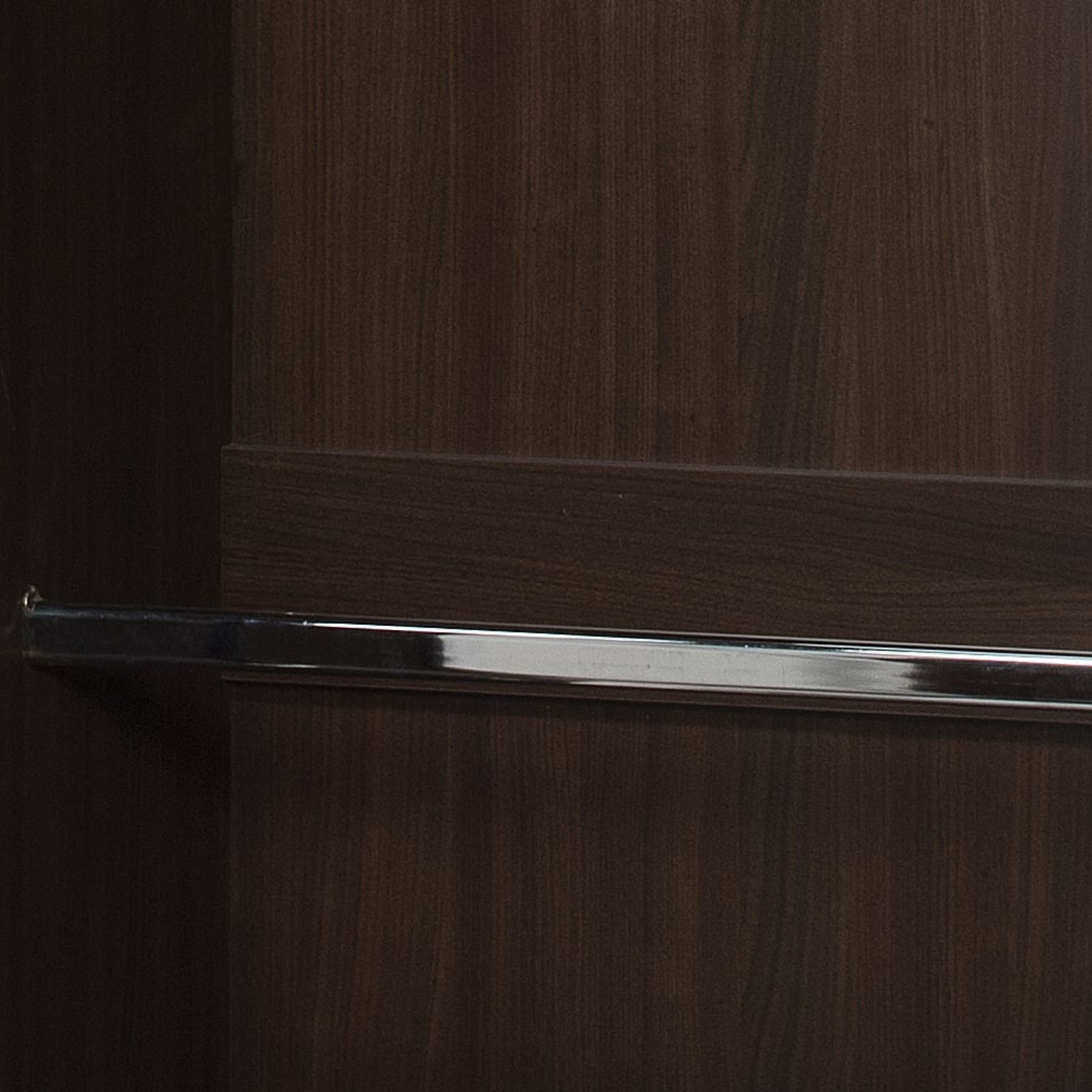 A sua estrutura de três portas inclui uma porta central com um grande espelho, ideal para conferir amplitude visual ao espaço e praticidade ao quotidiano. No interior, encontrará uma combinação equilibrada de calhas suspensas e prateleiras fechadas que lhe permitem organizar comodamente as suas roupas, acessórios e têxteis.