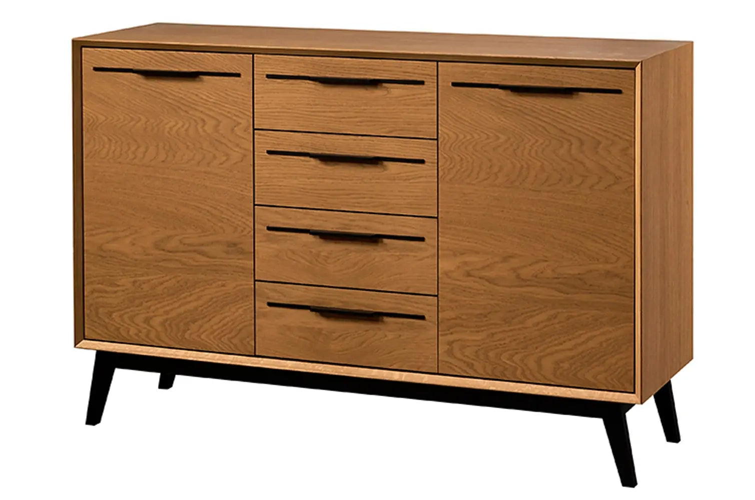 Com duas portas laterais e quatro gavetas espaçosas, oferece uma arrumação versátil ideal para a sala de estar, o quarto ou o corredor. A sua estrutura robusta, os puxadores em metal preto e as pernas em madeira maciça sublinham o seu carácter sólido e requintado.