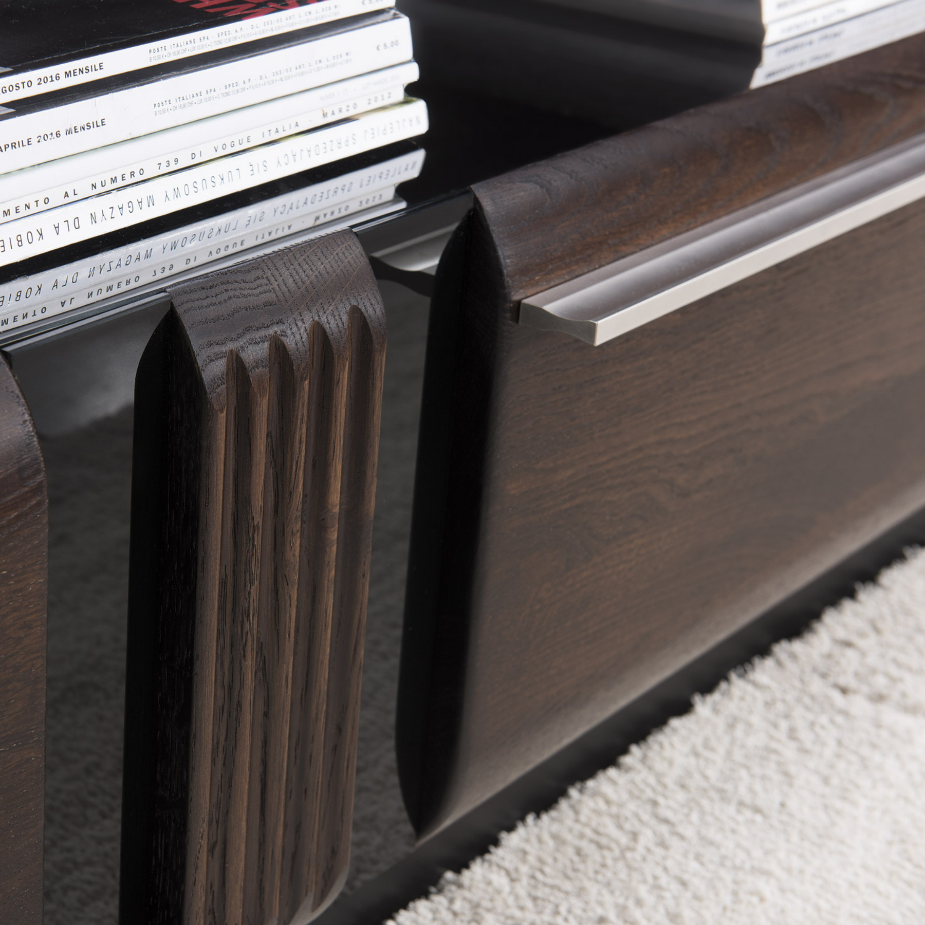 O móvel TV PORTI 25 combina design, funcionalidade e uma estética sofisticada que valoriza qualquer sala de estar. A sua frente é feita em carvalho maciço, acompanhada por detalhes em vidro temperado preto e molduras estriadas caraterísticas da coleção PORTI, que proporcionam textura e profundidade visual.