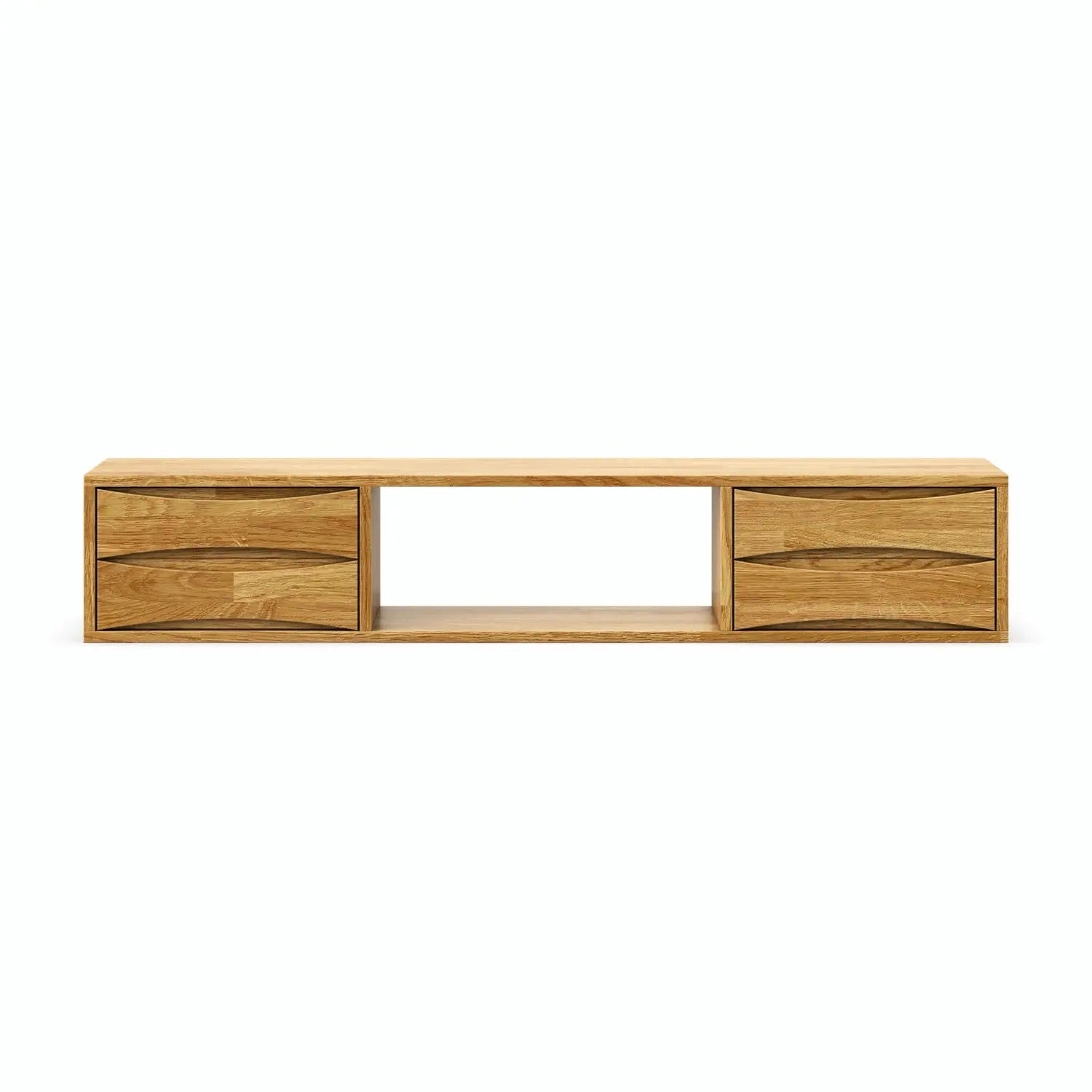Esta mesa de TV flutuante em carvalho maciço Malmo é a solução ideal para espaços pequenos. O seu design suspenso liberta espaço no chão, dando um toque leve e moderno à sua sala de estar. Com compartimentos de arrumação espaçosos, é perfeita para organizar os seus aparelhos electrónicos e acessórios, mantendo um aspeto limpo e arrumado.